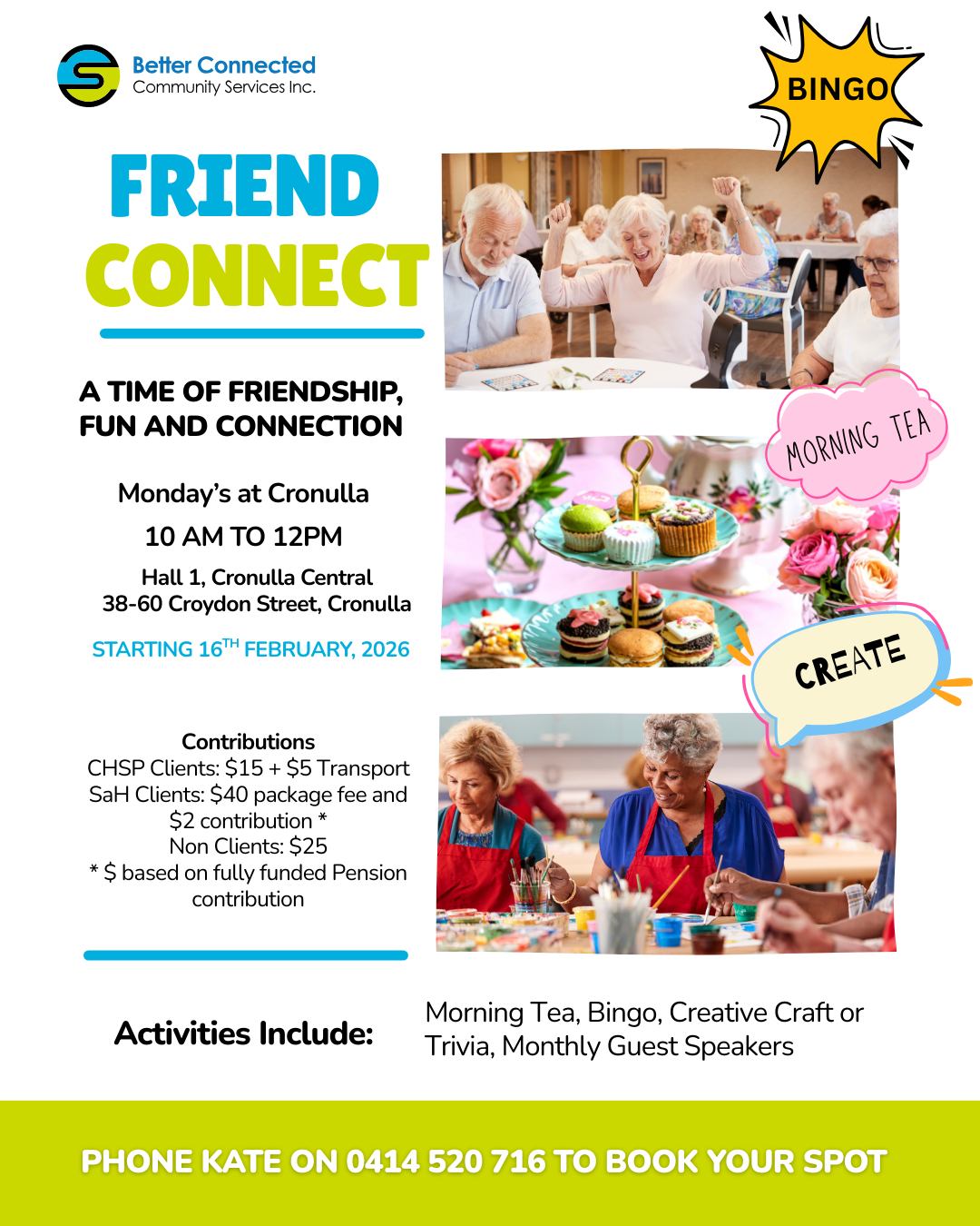 Better Connected Community Services group offers a welcoming space to meet new people and enjoy meaningful time together. Activities include bingo, creative crafts, trivia, and monthly guest speakers.
