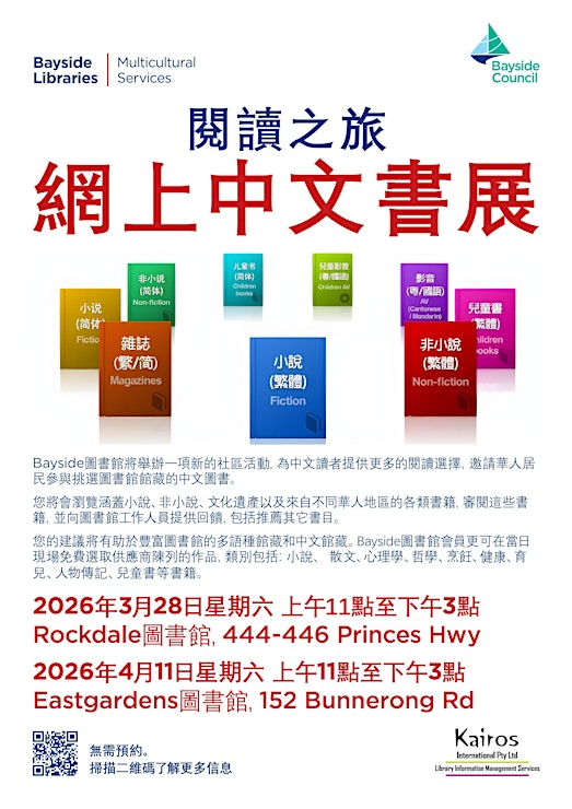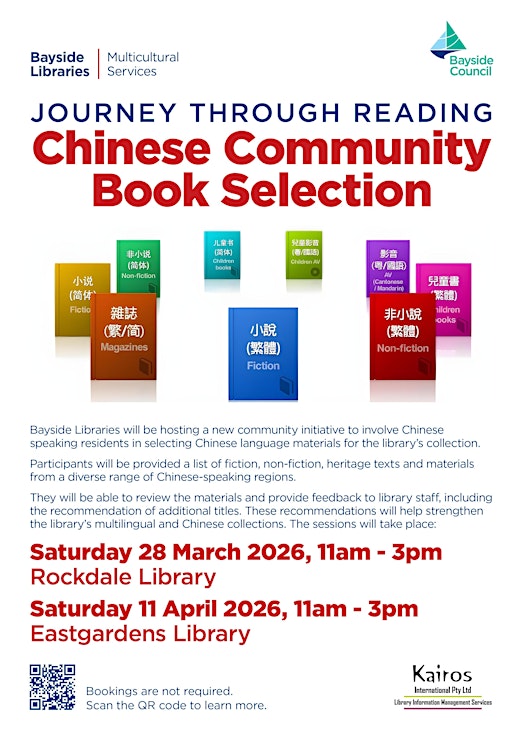 Bayside Libraries invites the community to select Chinese language materials for the libraries’ collections: review the materials and provide feedback to library staff, including the recommendation of additional titles. No bookings required – drop-in only.