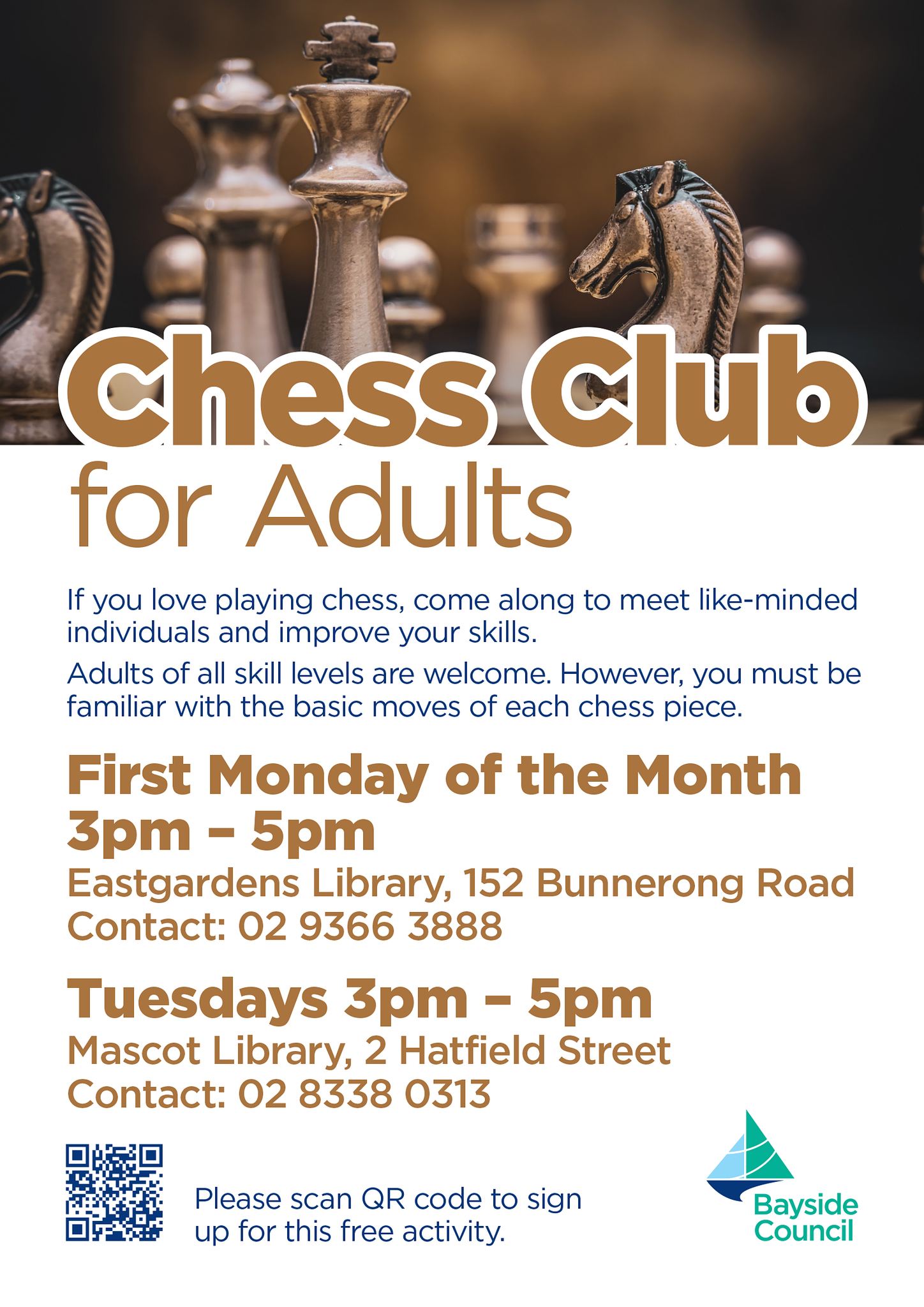 Club for people who love playing chess, to meet like-minded individuals. All skill levels welcome; must be familiar with basic moves of each chess piece.