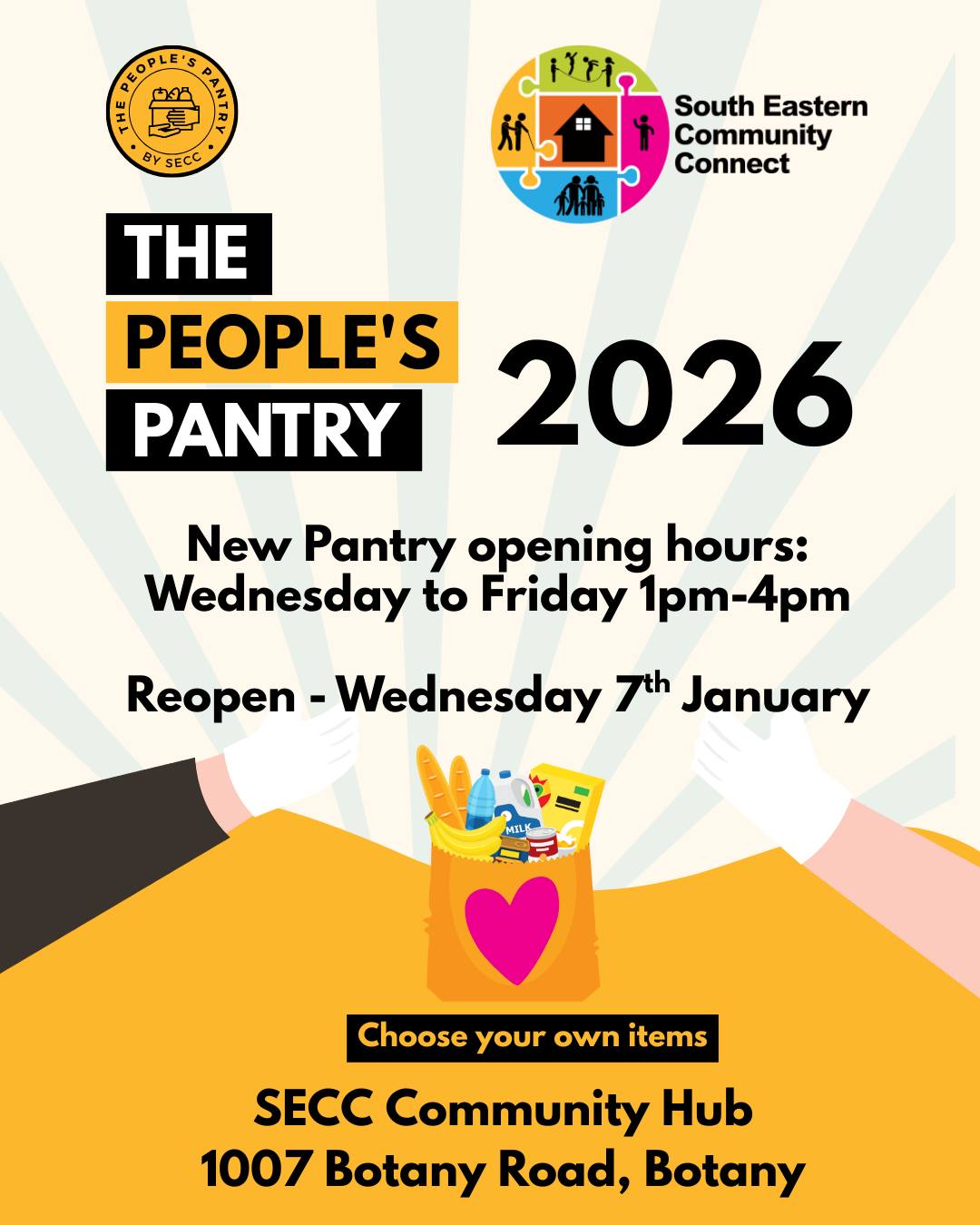 South Eastern Community Connect (SECC) The People’s Pantry helps to address food insecurity for residents of Bayside. Residents can select a combination of canned and packaged food, as well as pet food and supplies, and sanitary and cleaning products. Both food and financial donations from community members welcome – see website for details.