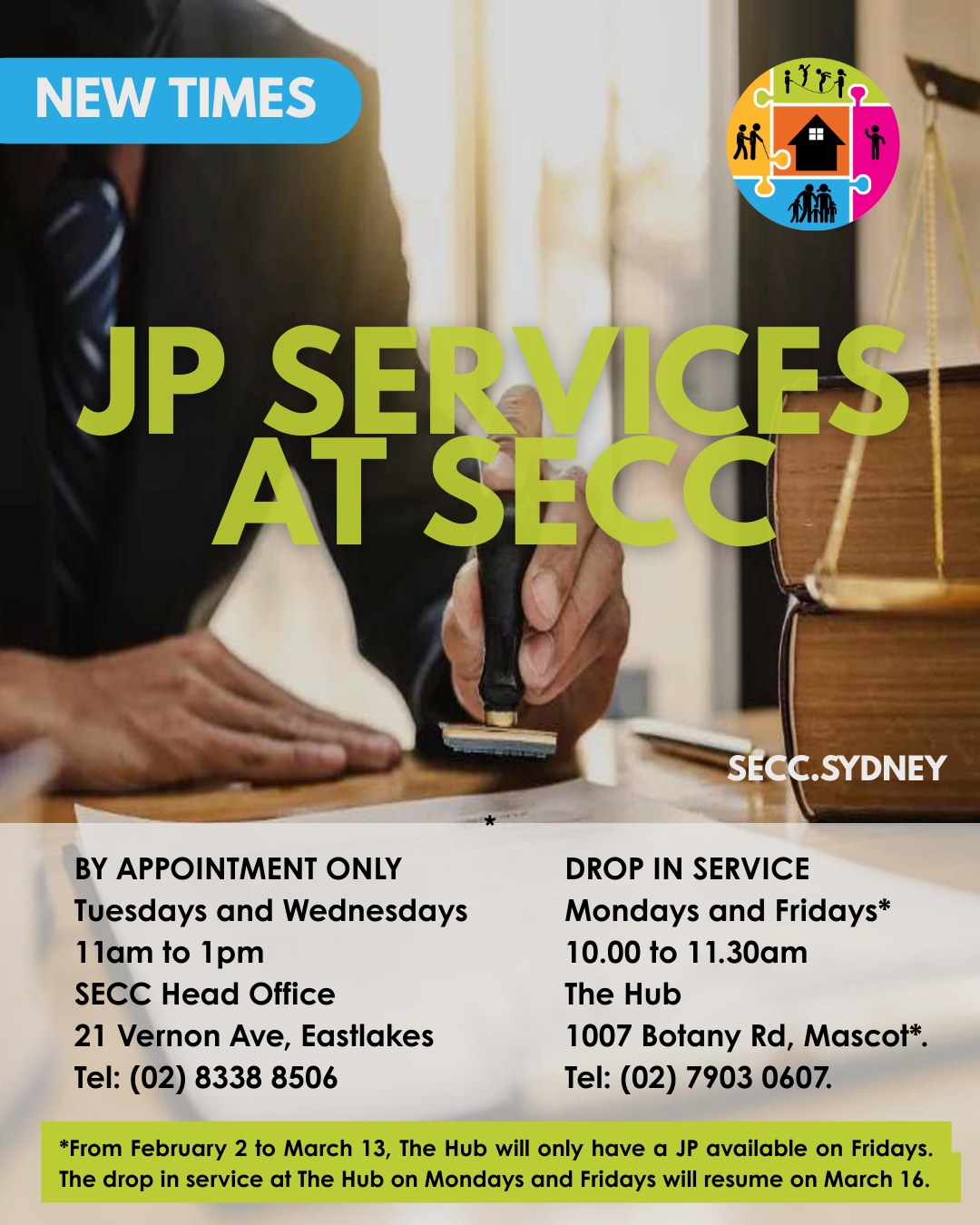 – Eastlakes: Tuesdays & Wednesdays (by appointment), 11am-1pm | SECC Head Office, 21 Vernon Ave, Eastlakes | Appointments: 8338 8506