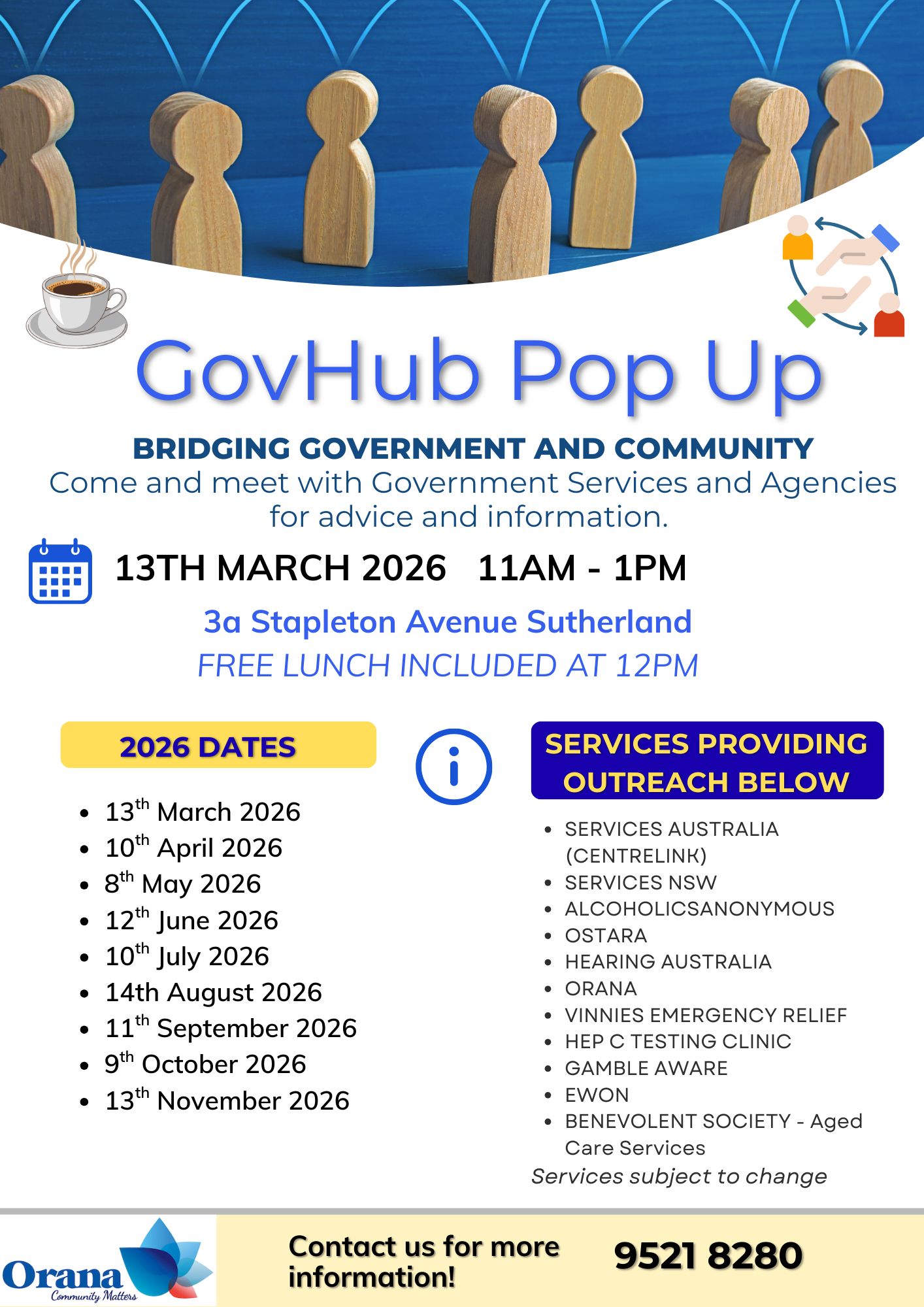 Orana and partners offer a monthly GovHub Pop Up where people in Sutherland Shire can seek advice and support from government agencies and community organisations. Meet with services all in one location, including Services Australia, Service NSW, Homes NSW, Hearing Australia, Vinnies Emergency Relief, and more.