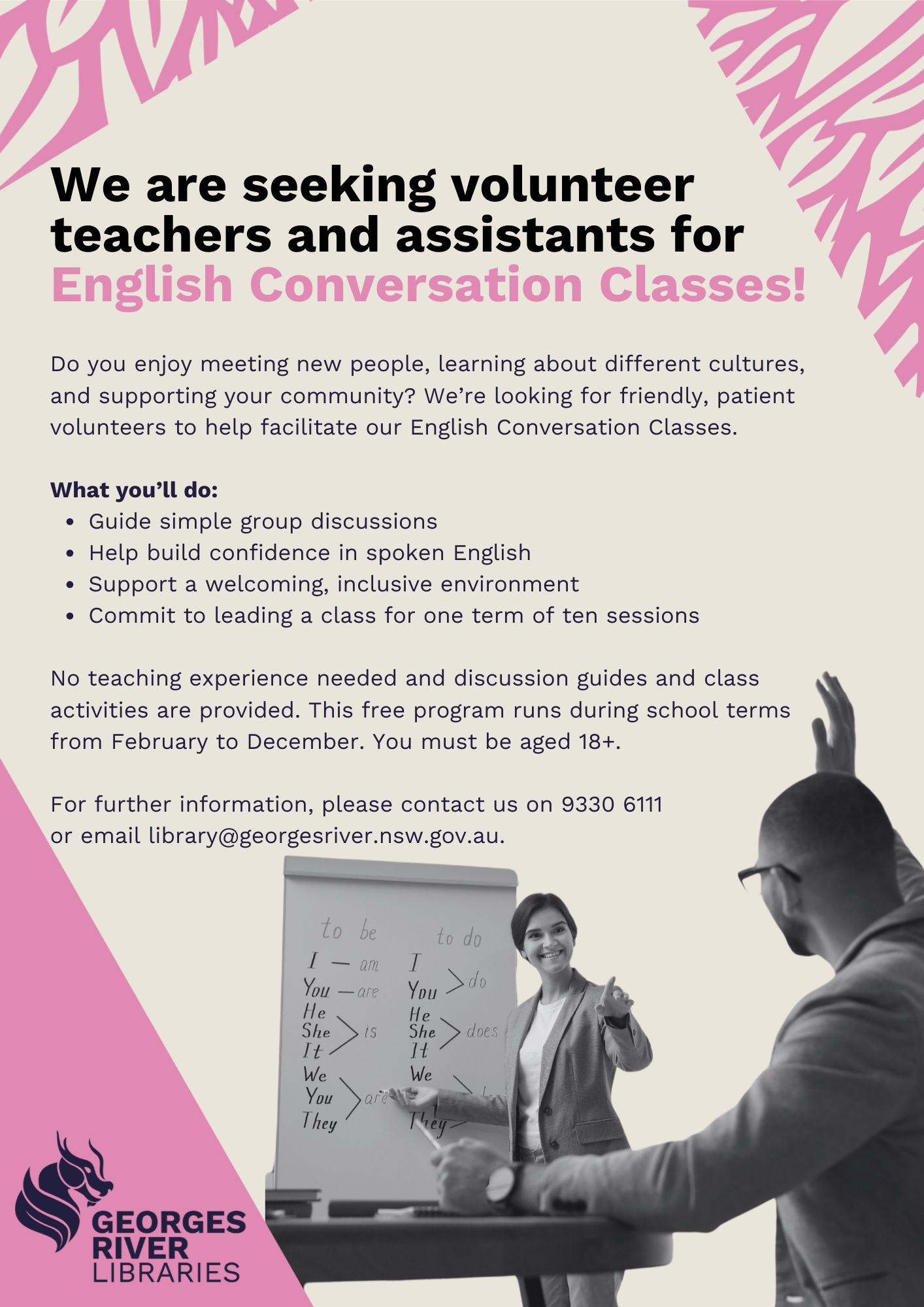 Georges River Council Libraries are looking for friendly, patient volunteers to help facilitate their English Conversation Classes. Volunteers guide simple group discussions, help build confidence in spoken English, support a welcoming, inclusive environment, and commit to leading a class for one term of ten sessions. No teaching experience needed.